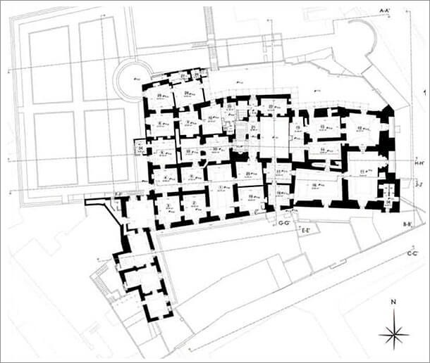 L’intera costruzione si articola in cinque corpi, individuati quali il Palazzo Vescovile, il Seminario, il Conventino, il Padiglione militare, i Corpi ottocenteschi, che coprono una superficie totale di circa mq. 15.800,00 oltre ad aree esterne (quattro corti – nn. IV, V, VI, VII, cui si aggiungono due spazi aperti confinanti con i muri di cinta del lotto, uno posto a sud-ovest e l’altro a nord-ovest – nn. I-II – ed un terzo collocato al confine settentrionale – n. III), per una superficie complessiva di circa mq. 7.900,00.